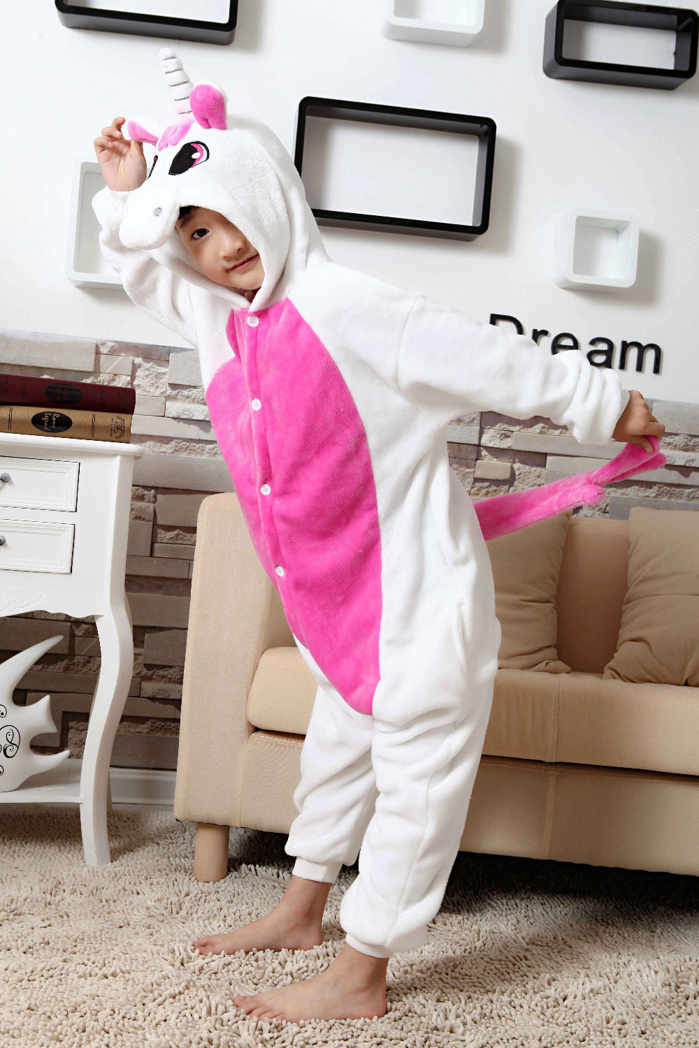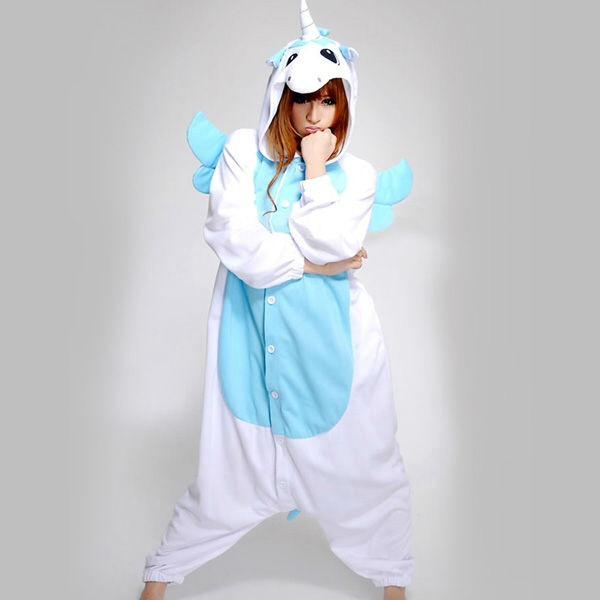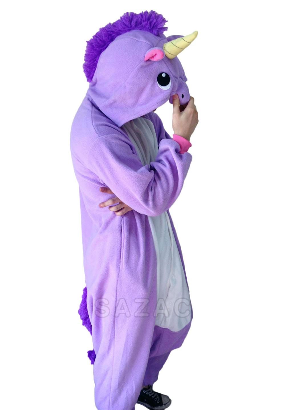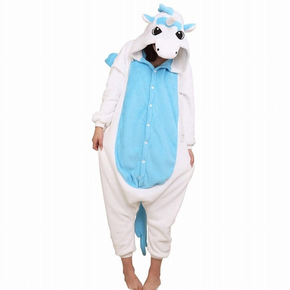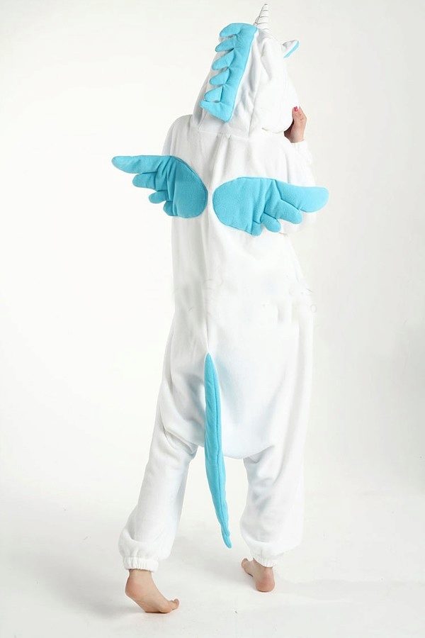 Funny pajama unicorn is a costume of a mythological animal. It can be just pants and a blouse, decorated with the image of a fairytale horse, but also a jumpsuit with three-dimensional details: a round belly, big ears, a mane, blue wings, a huge horn on the hood.