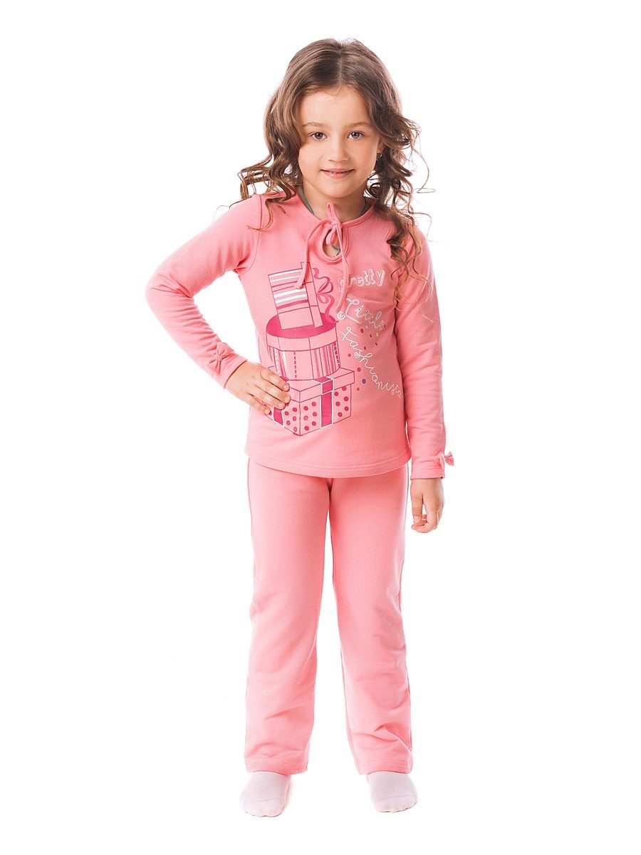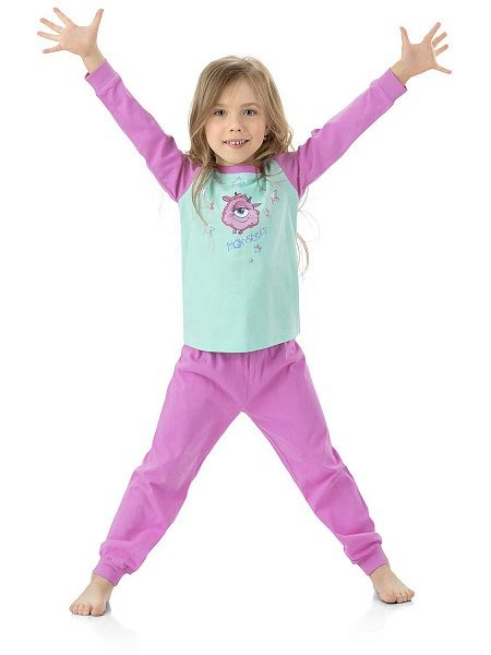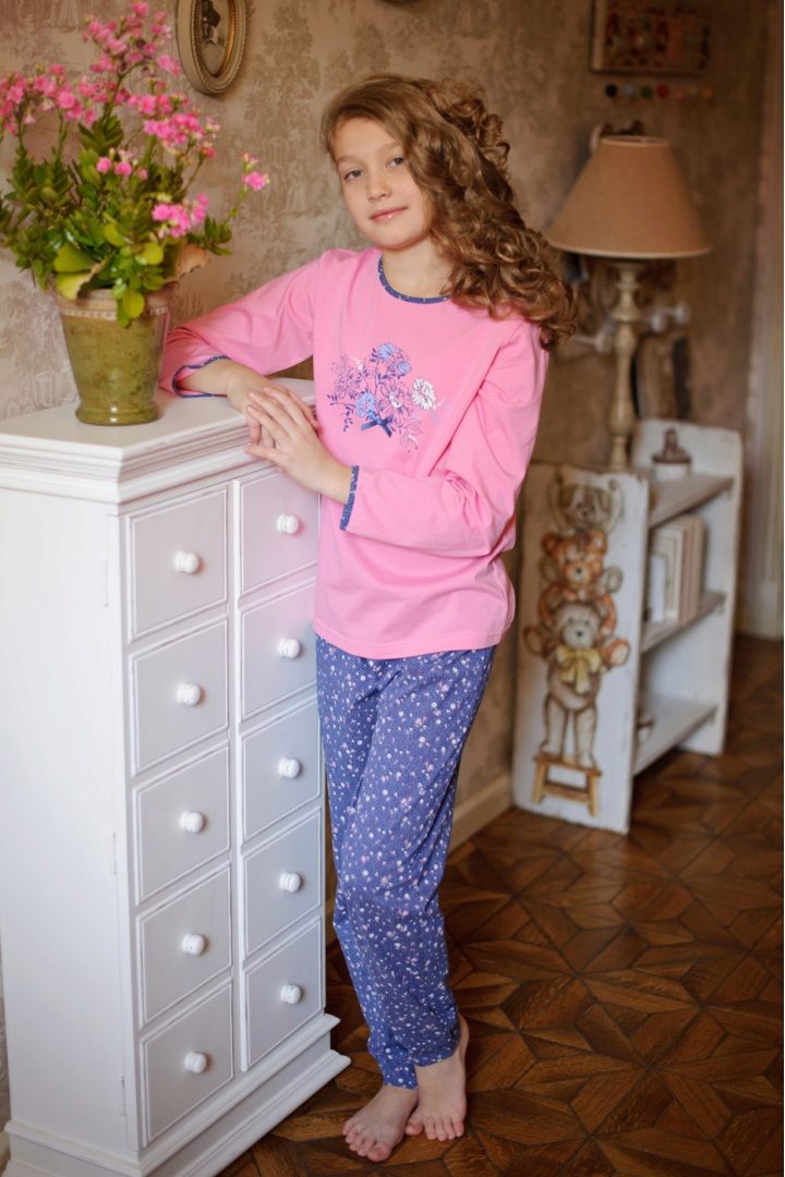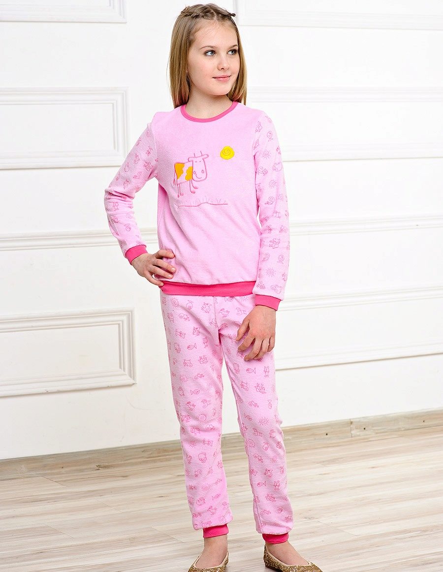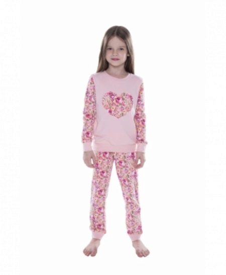 Pink color and heart print are adored by all girls! Pajamas are made in a free, straight cut with a round neck and soft knitted cuffs on the trousers and sleeves of the jacket. This model does not hamper movement, it is very warm and comfortable.