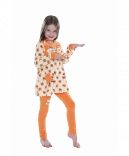 Bright, stylish pajamas are made in the form of a loose, wide blouse and narrow trousers. The warm orange color and cheerful print in the shape of the muzzles of funny little animals will surely please the little fashionistas!