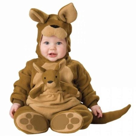 The model kangaroo clasp made in the form of buttons. A pocket on the stomach is also fastened on them, which is justified by a funny little kangurean face, looking out. In the sewn cuffs on the arms and legs are inserted soft, not pressing gum, which does not allow the cold to get inside. The hood is deep enough to keep the neck and ears from freezing.