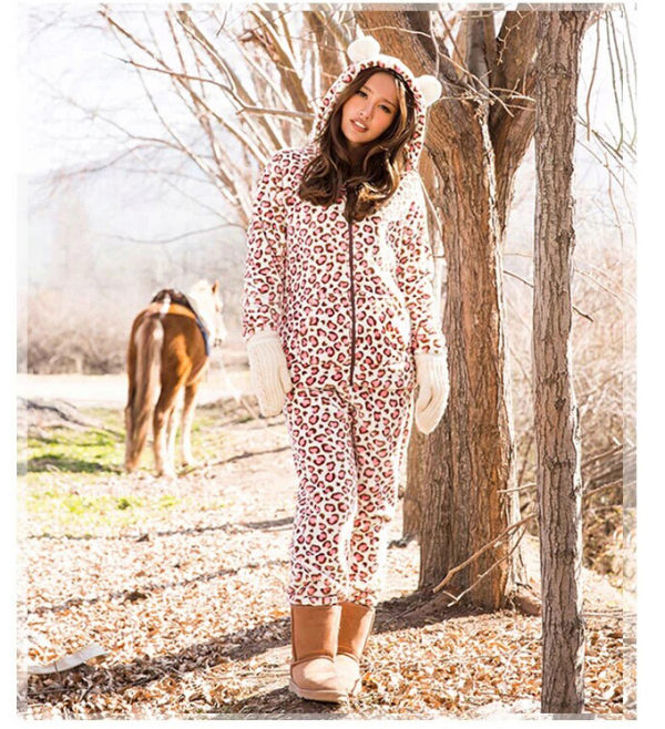One of those cases when the Kigurumi pajamas are appropriate not only at home, but also on the street, for example, in the courtyard of a country house. Sheepskin and ugg boots will make a great company in a jumpsuit with animal print and ears on the hood.