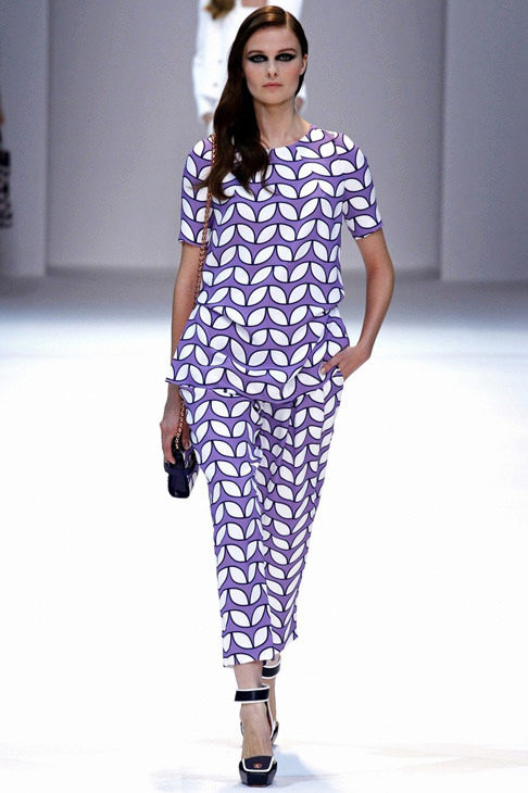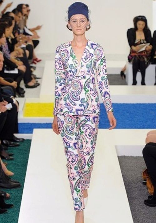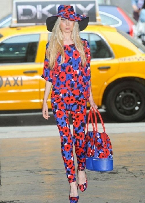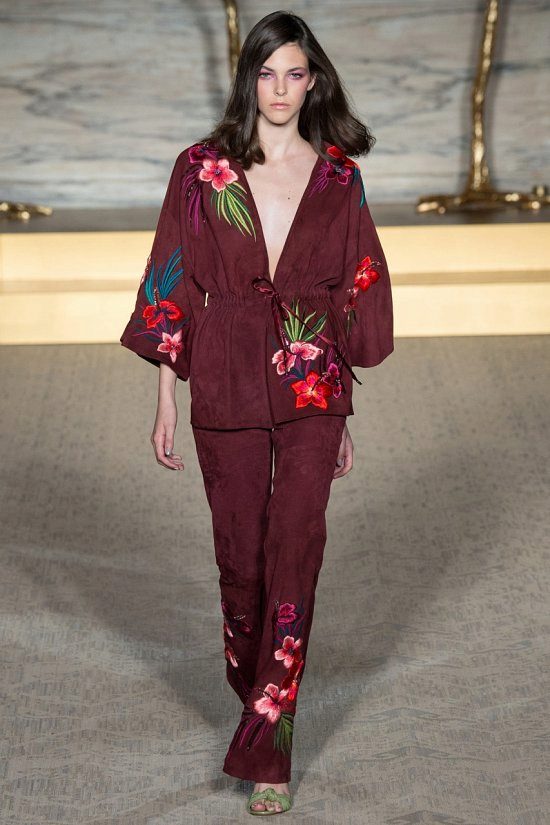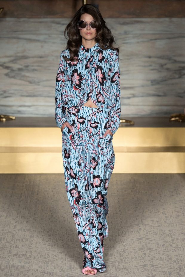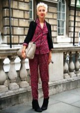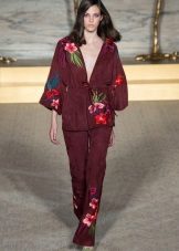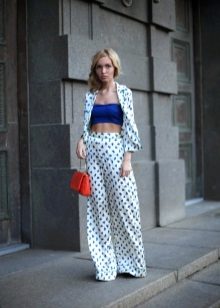 An interesting solution is the sleeves on the cuffs or elastic, tucked inward and creating a certain amount at the wrists and the length. Ultra wide trousers with cuffs, maxi length. Makeup with an emphasis on the lips, lipstick to match the flowers on pajamas-suit. High-heeled shoes so that the pants visually look too long, and the shoes were not visible.