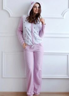 Pajamas-suits with a sports direction - from plush, cotton are popular among young people. At the same time, there are models in the form of overalls, for example, from plush, with a hood and ears on it, imitating animals - a panda, a bear, etc.