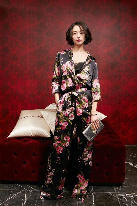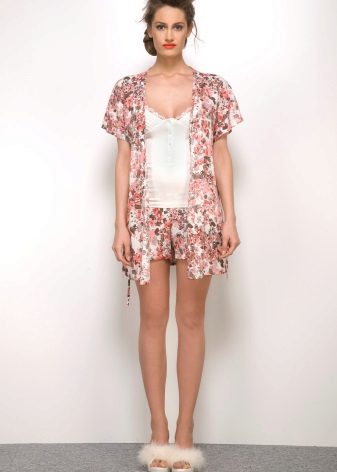 Japanese-style kimono pajamas in dark color with bright floral pattern look fresh and stylish. The subtlety gives the bottom T-shirt or shirt with lace trim under the top shirt jacket. The top of the set is made in a classic style - straight cut, collar, buttons and a belt.
