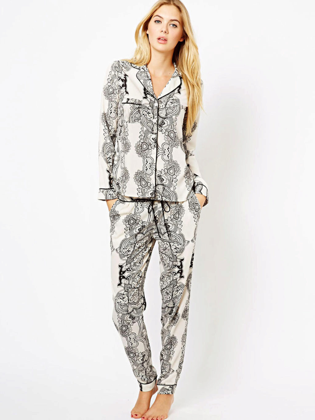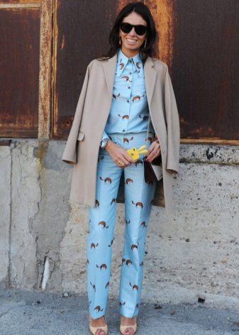 Even in the office, the pajamas-suit of light tone with a black patterned print will make it look stylish. The shirt is made in the classic style with buttons, with a fold-over collar and the thinnest pajama edge in contrasting black, as a pajama accent chest pocket and piping along the edge of the cuffs. Pants on the drawstring narrower cut with pockets, cuffed from the bottom. Makeup is not bright, everyday. Perfect shoes with heels.