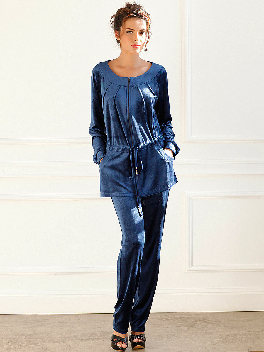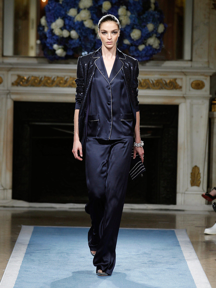 Free-style pajamas with seemingly large size give the image fragility and originality. A long-sleeved pajama shirt with a smell on a long belt, with a turn-down collar and contrast edging is worn like a naked body. Pants, slightly narrowed, semi-fitting straight cut give slimness and lengthen legs. Color - black or blue, in combination with white edging, slightly soothe the "pajama" insolence.