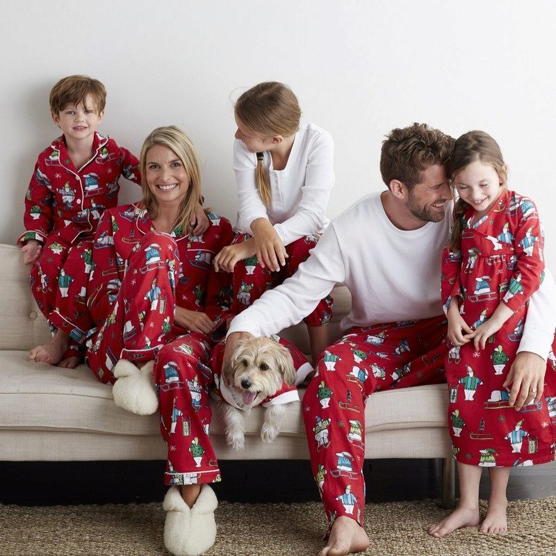 Bright Christmas pajamas are already setting up a festive mood. In this case, no suit is repeated. All five sets are made in an individual style (a red pajamas dress, a light white shirt and bright red pants, a completely red suit with a white edging), but have one common line - red and a new print on the New Year theme.