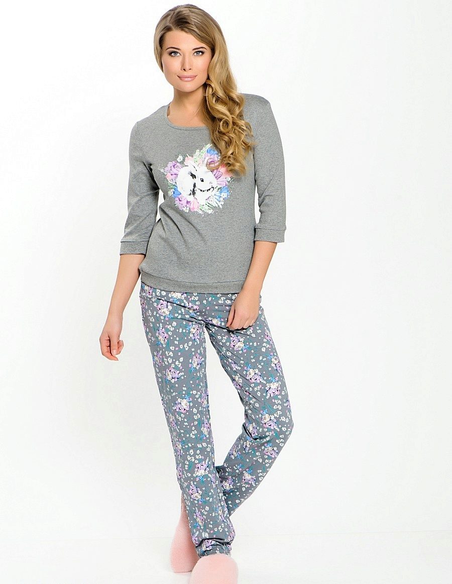 - With pants. A set of such pajamas includes trousers of straight cut or narrowed, on an adjustable belt, with elastic bands at the bottom, long-sleeved T-shirts, jumpers with long sleeves, a hood on the drawstring and elastic at the bottom of the model for a more comfortable fit.