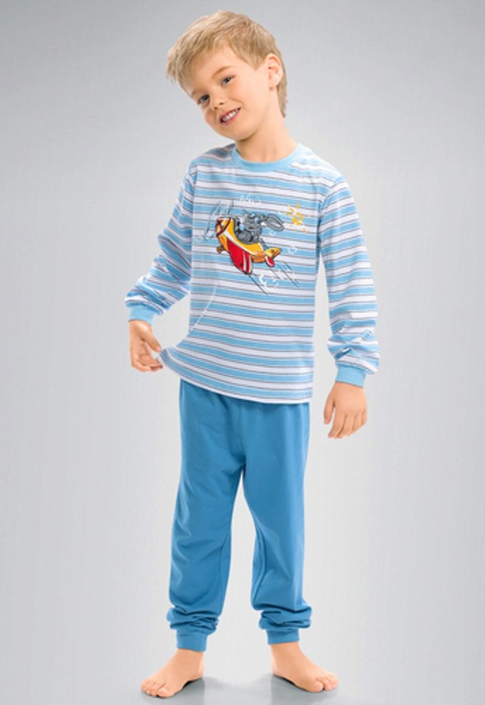 Comfortable pajamas of light blue knitwear with wool. Monochrome pants are complemented by a blouse made of a striped partner fabric with an image of an airplane. Soft cuffs on the sleeves and legs of their pajamas will not allow them to gather from bedtime and deliver discomfort to the child.