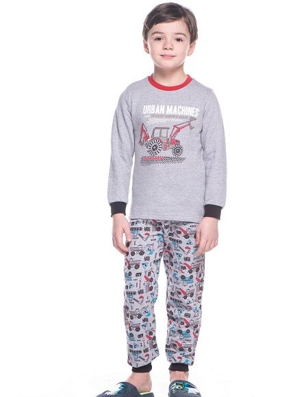 A beautiful gray pajamas that win the heart of every boy. The print in the form of an excavator is printed on the chest of the jacket, the same pattern, but smaller, is repeated on the pants. The model is complemented by contrast cuffs and collar.