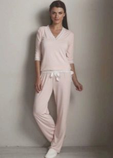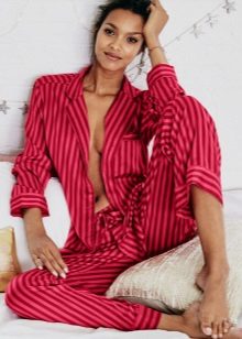Pajamas at the junction of home outfit and office style once again prove that the imagination of designers is limitless. A gentle milky blouse with thin horizontal stripes, echoing the color of the sleeping trousers, creates a romantic and cozy mood.