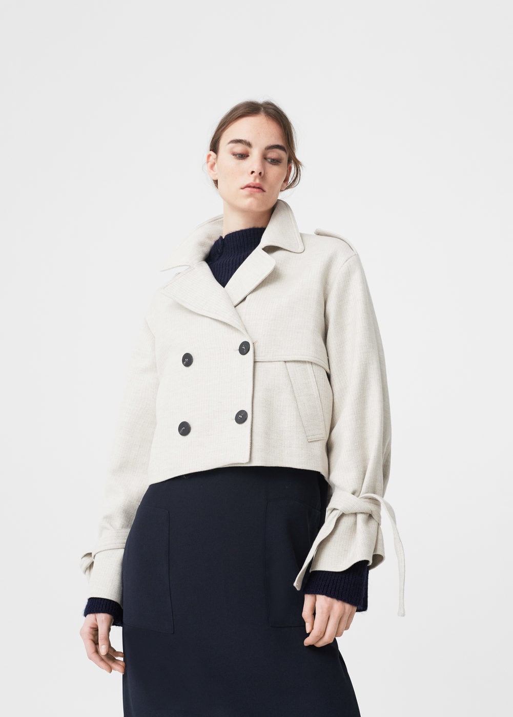 Collar with lapels, decorative buttons and stylish strap on the shoulders will suit any lady who wants to look original and modern. These products from a well-known brand should be protected from prolonged exposure to sunlight and do not leave them near batteries. In addition, a mango raincoat or trench coat is strictly forbidden to dry in the dryer, as this can lead to serious deformation of the product.