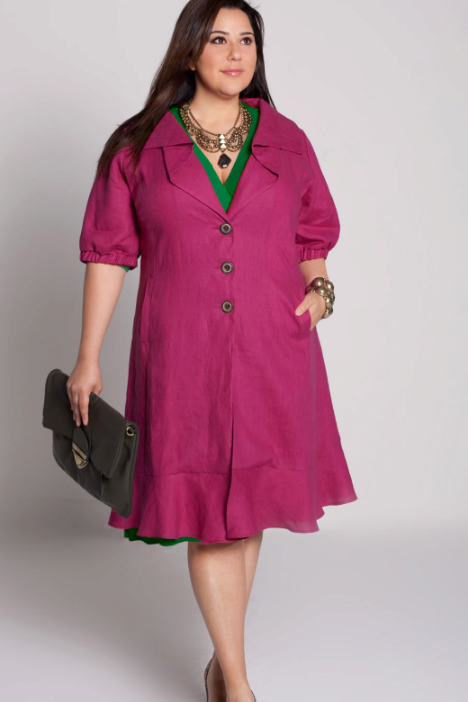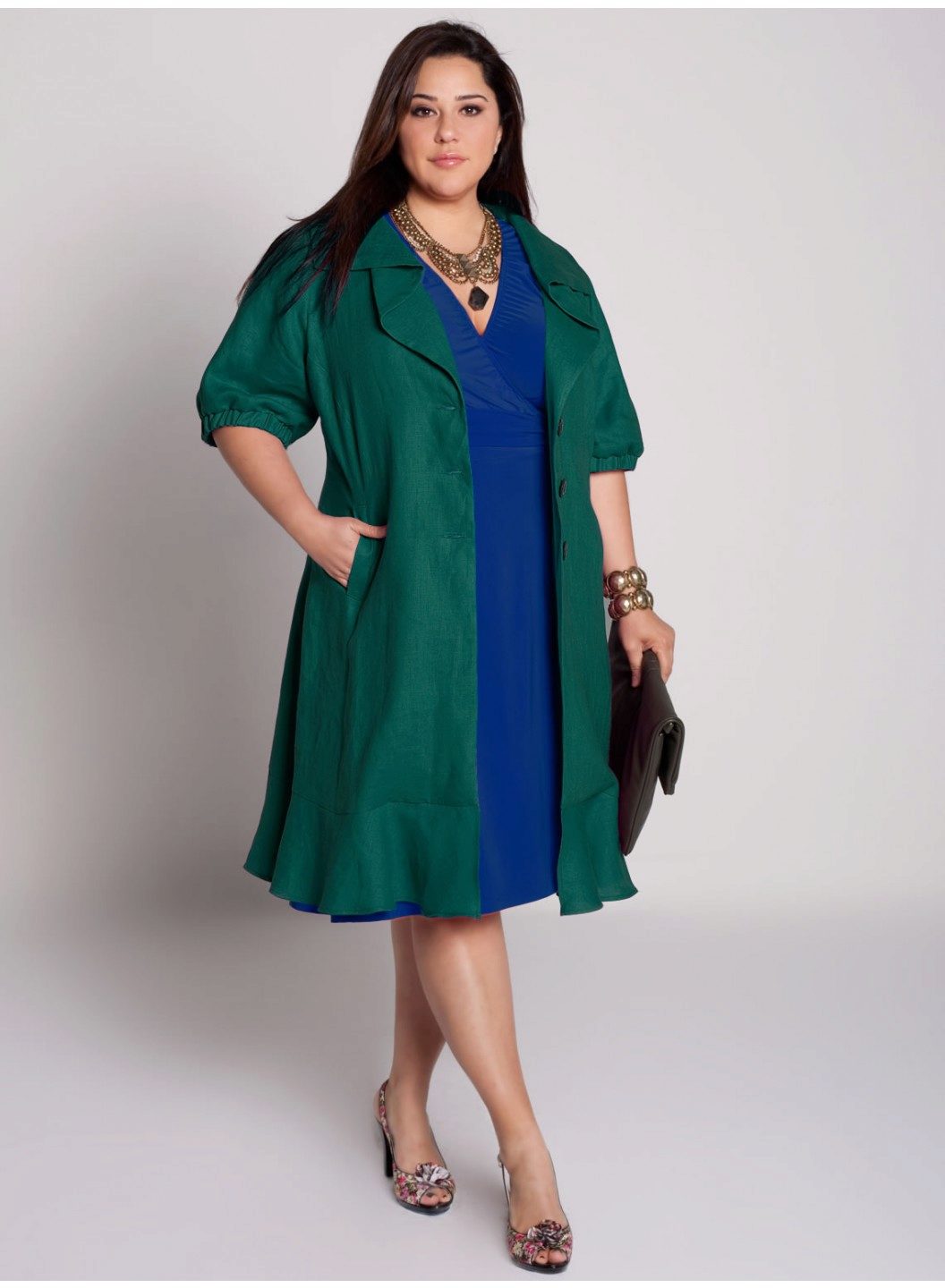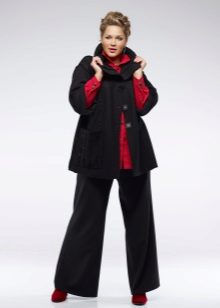 An excellent choice for obese women is a high-waisted cloak. It masks the abdomen and thighs well, and also balances proportions. The emphasis here is on the chest, emphasizing its advantage.