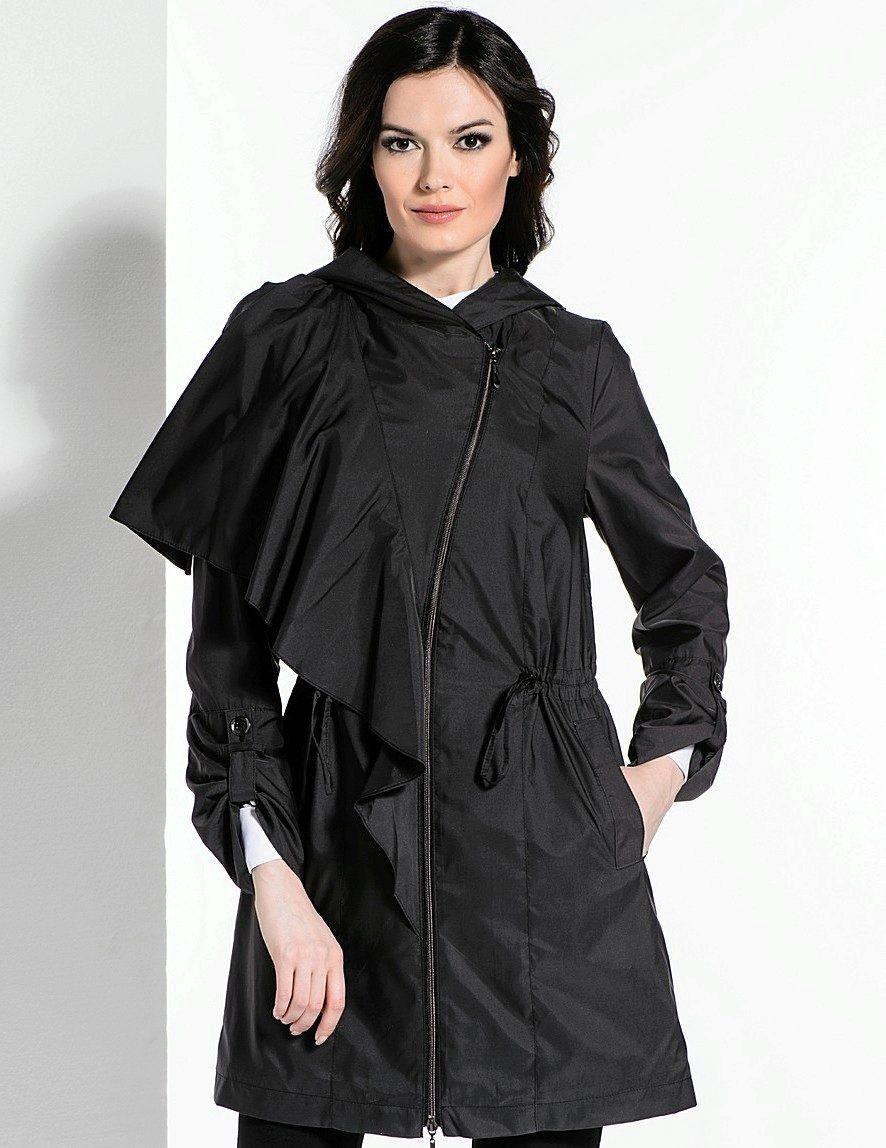 Those who do not like to merge with the crowd and used to stand out in everything, manufacturers offer unusual, interesting solutions. For example, the original insulated raincoat of a large size with a shortened sleeve. Or a cape of an unusual asymmetric cut. In this style, the length of the product is shorter in front and longer in the back. Models with the original fluffy sleeves will give the image brightness.