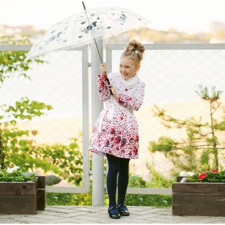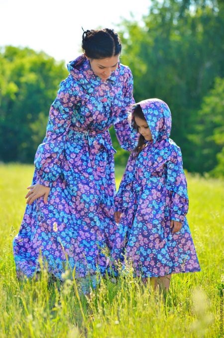 If a raincoat is meant for going to school and will cover a school uniform with a skirt or a sundress, then its length should be just below the knee. If the main function of a raincoat is to serve as a faithful companion to jeans and pants on active walks, then you can choose a length above the knees or a shortened version.