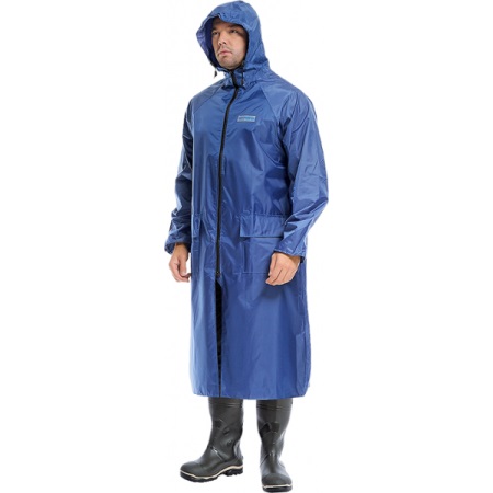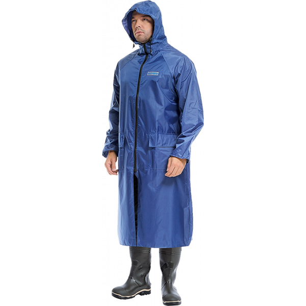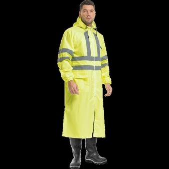 Of the available models for working in the fresh air, we can recommend a long waterproof coat “Poseidon”, it is sewn without lining, fastens with four buttons, has a straight silhouette, a detachable hood and taped seams. The product is made of raincoat synthetic material with a special polymer coating. Available in black, blue, green, yellow, orange and fluorescent colors.