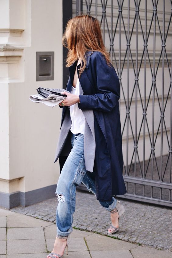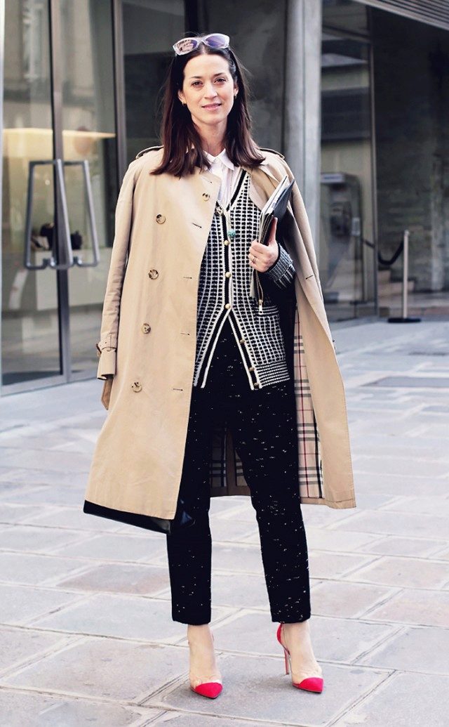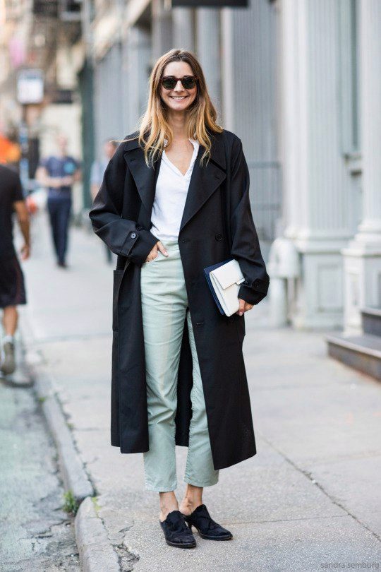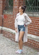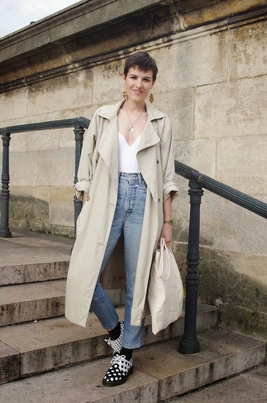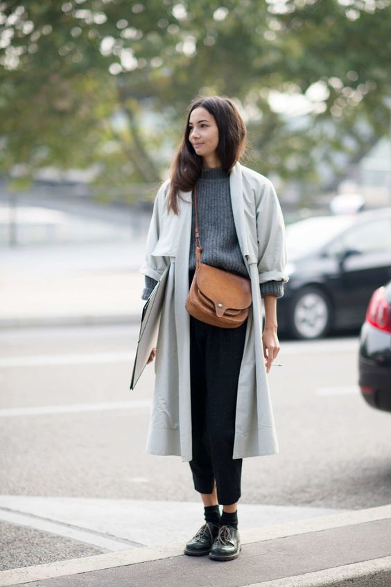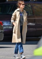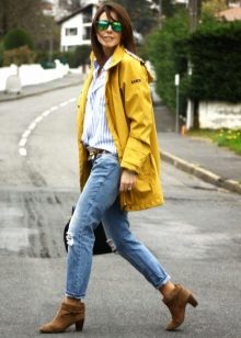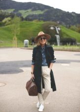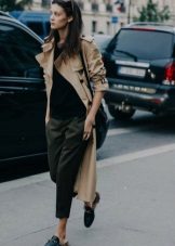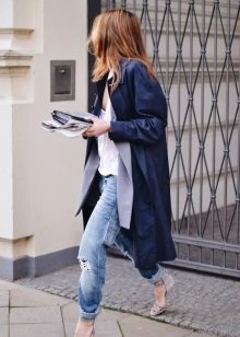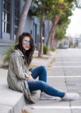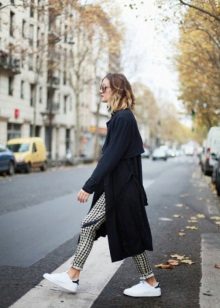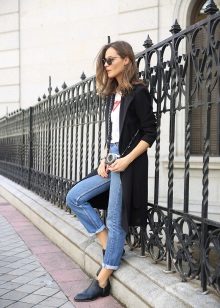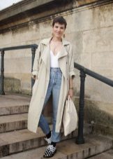 If you prefer shoes on a low run, wear a raincoat with tight pants or jeans. In tandem, they will look the most harmonious. You can also try not very wide boyfriend pants or mom-jeans.
