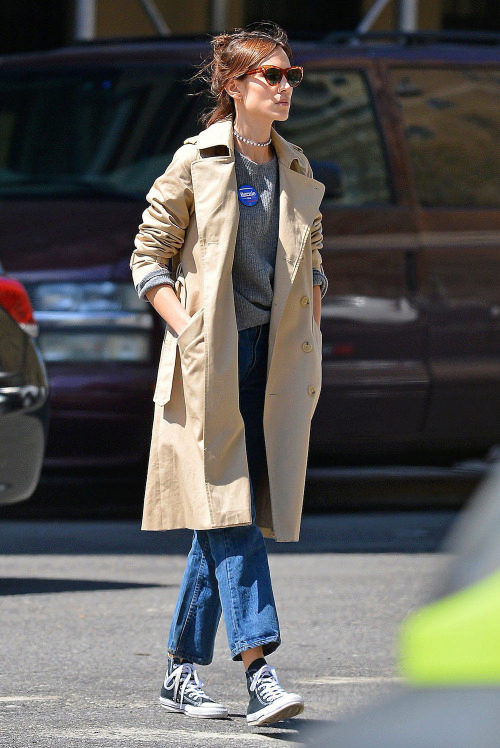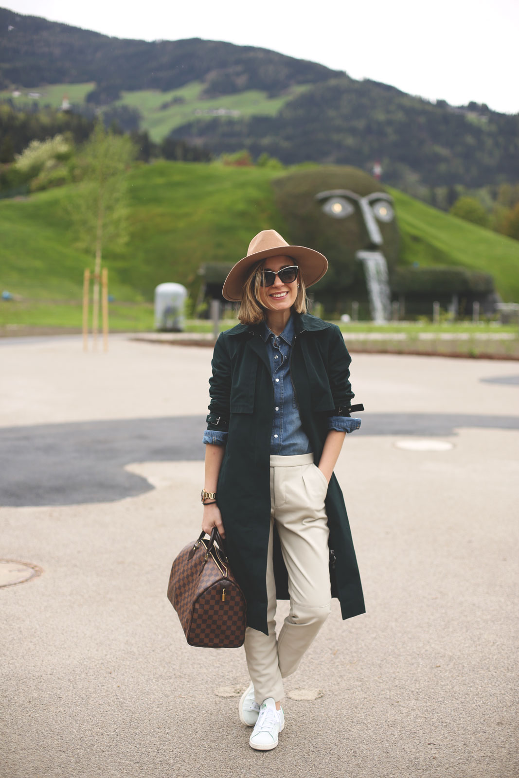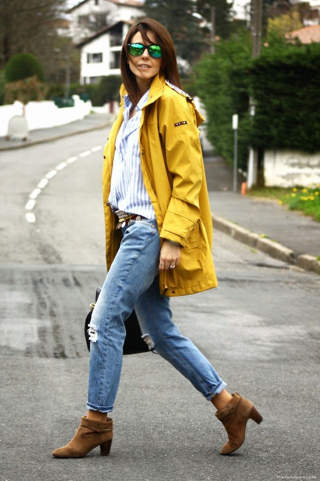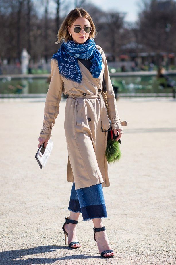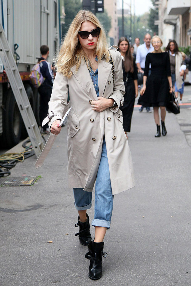 If you prefer shoes on a low run, wear a raincoat with tight pants or jeans. In tandem, they will look the most harmonious. You can also try not very wide boyfriend pants or mom-jeans.