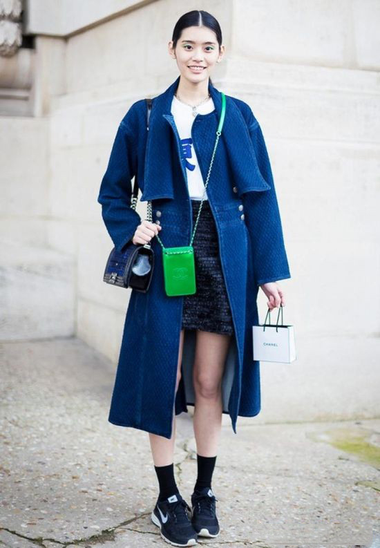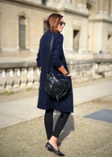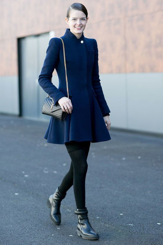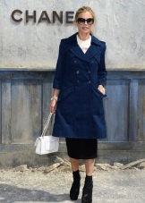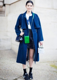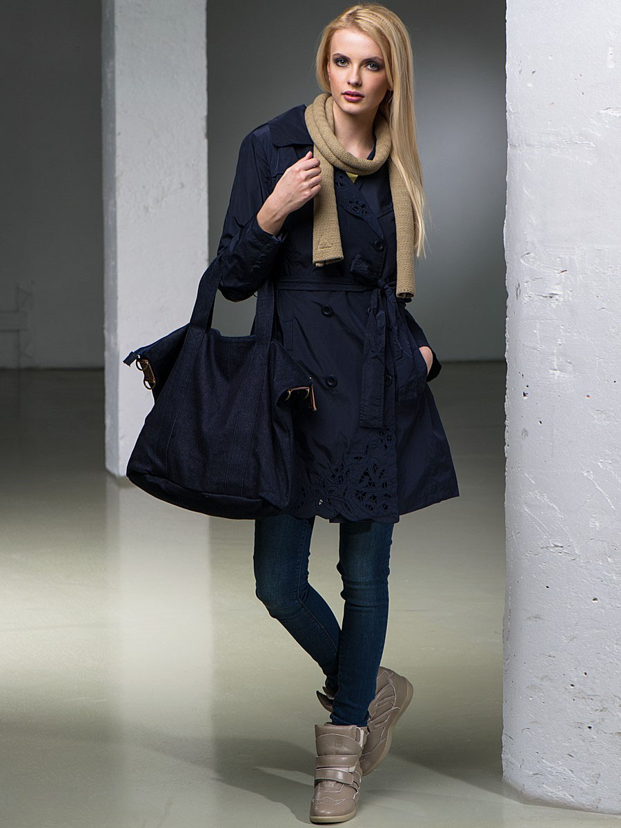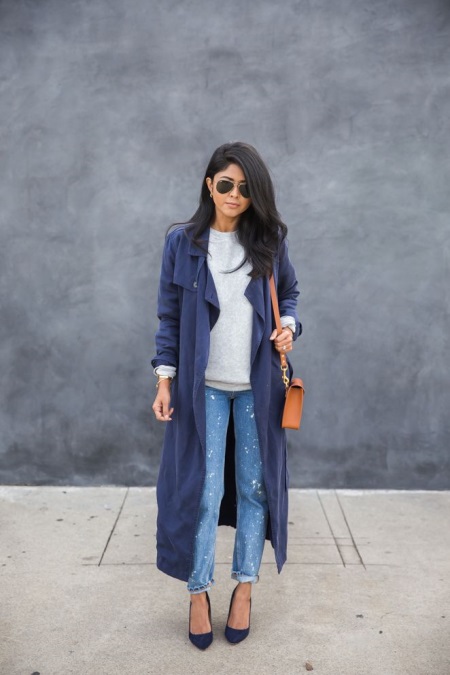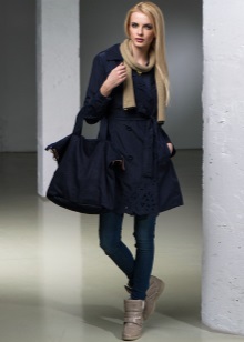 In a business wardrobe, a raincoat up to the knee of indigo will be appropriate. Combine it with a strict dress, high black boots and a beige scarf with blue polka dots. Complement the image of a roomy black bag and sunglasses.