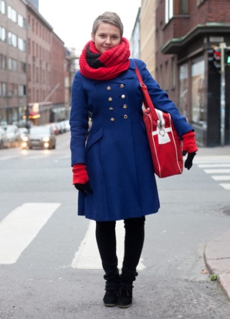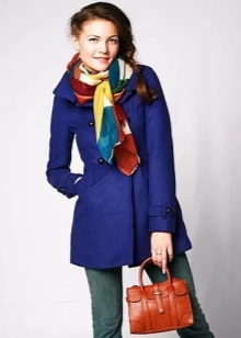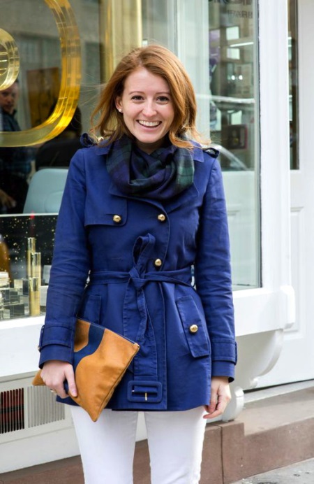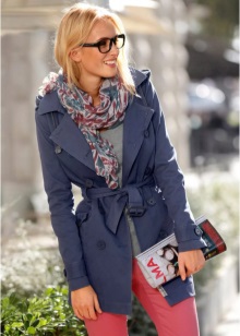 It is quite simple to choose a scarf under a blue raincoat, as there are no particular limitations on the choice of colors. It will look good beige, gray, white, black, red, yellow, pink. You can also choose a scarf of any shade of blue or blue, but it is better if such a product is complemented with an interesting print - a pea, a cage or a stripe.
