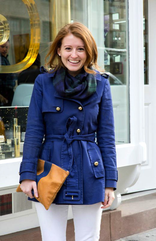 Wear a cropped navy blue coat with white skinny jeans and a checkered scarf. Complete your look with brown heeled ankle boots and a tone clutch.