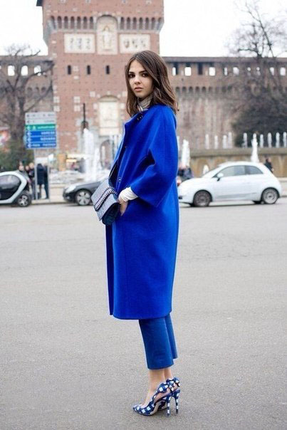 Great looking monochrome images, collected from shades of blue and blue. For example, you can wear bright blue pants or a skirt, a blue blouse and blue polka-dot shoes with a blue-gray or bright blue trenchcoat. It will turn out very stylish thoughtful look.