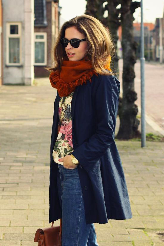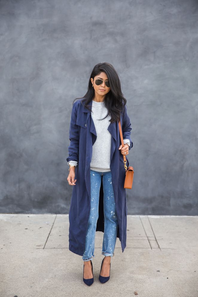 A win-win for every day - blue jeans and a striped jumper, complemented by a half unbuttoned raincoat. You can complement the image with both sneakers and high-heeled pumps. In general, the dark blue color looks perfect in a pair with a strip, so this combination is worth adopting.