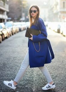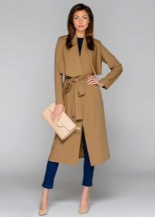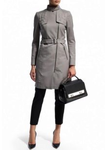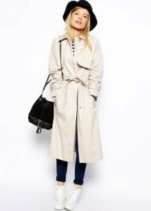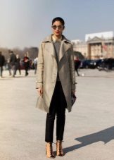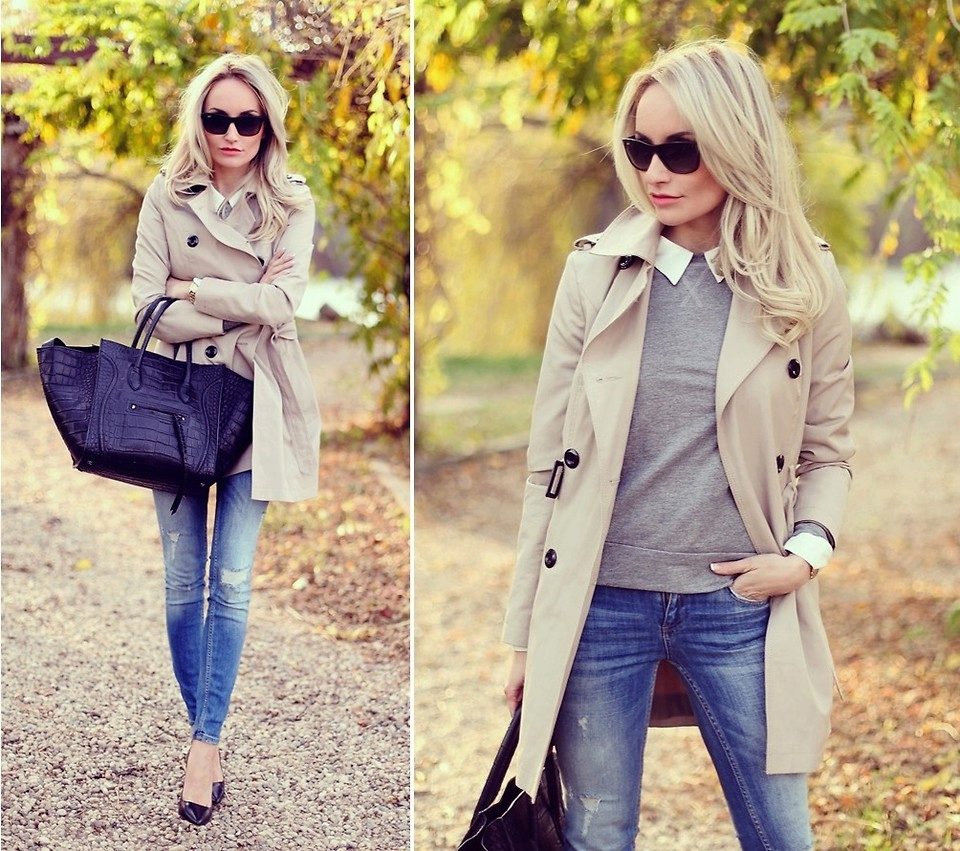 A rather stylish look is obtained with a classic white shirt, a gray monochromatic sweatshirt and jeans with small holes. A classic cream-colored cloak with a wide belt made of the same fabric is perfect for this set of things. In addition with black ballet flats and a big black bag, the look will be irresistible.