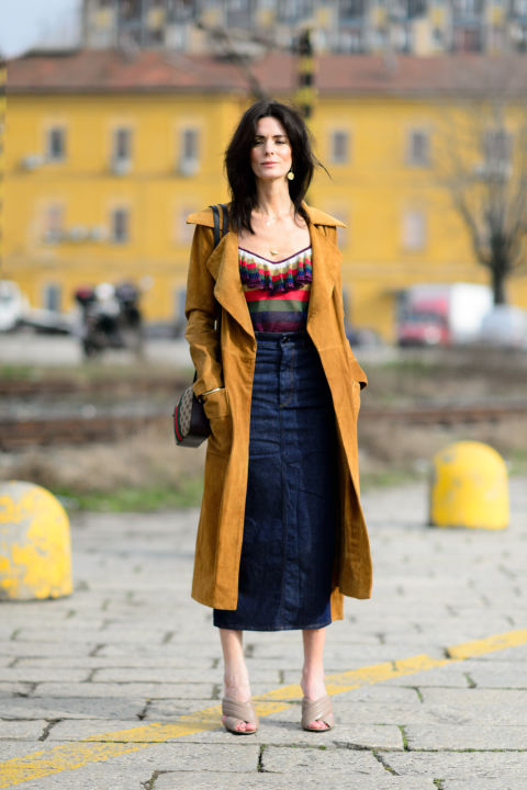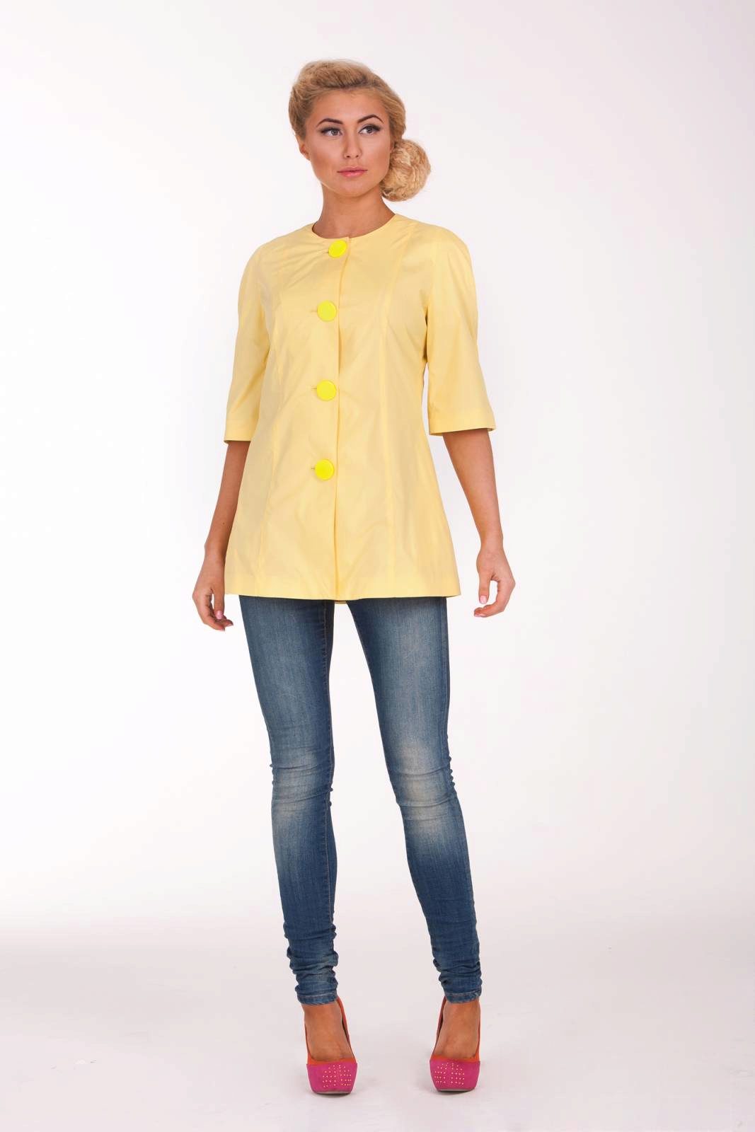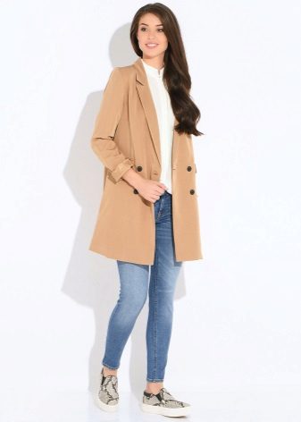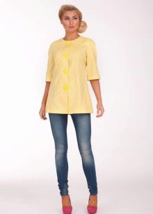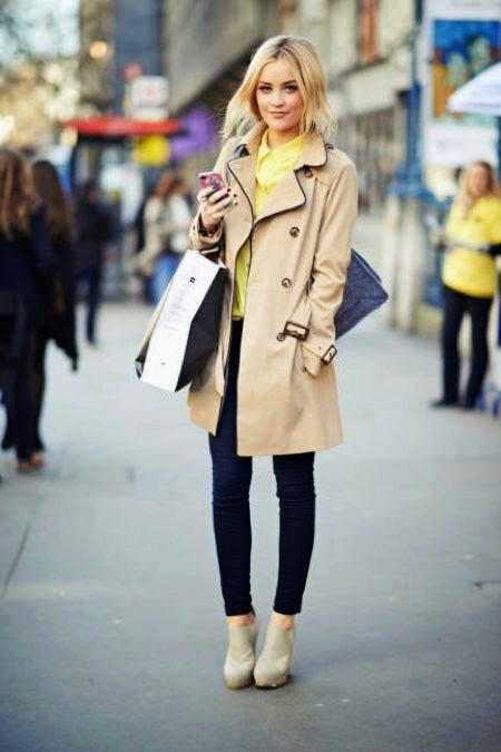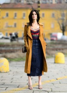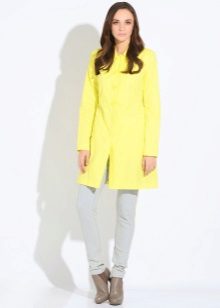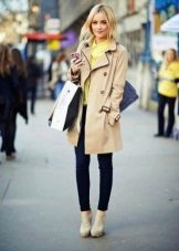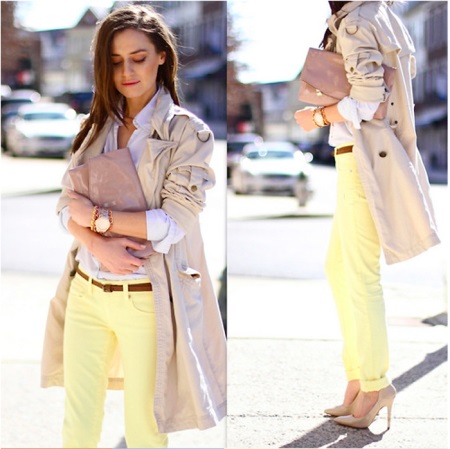 Incredibly gentle look is obtained by choosing a straight-cut lemon denim trousers, a white shirt and an ivory-colored raincoat. In addition to beige shoes and a clutch to match the tone, the outfit will look more elegant, and if you bend the sleeves of your raincoat, then the image will be a little cheeky.