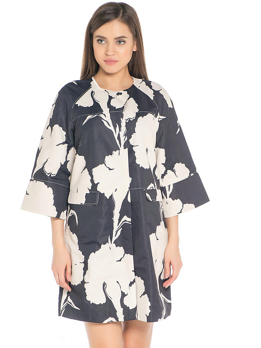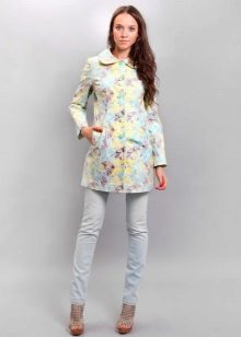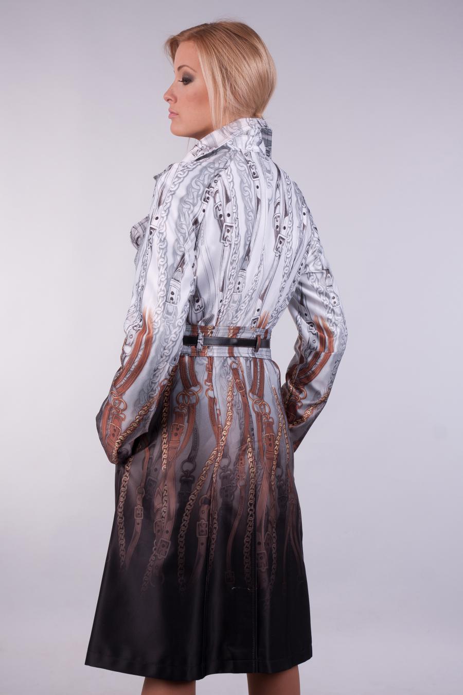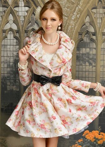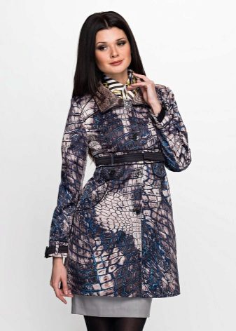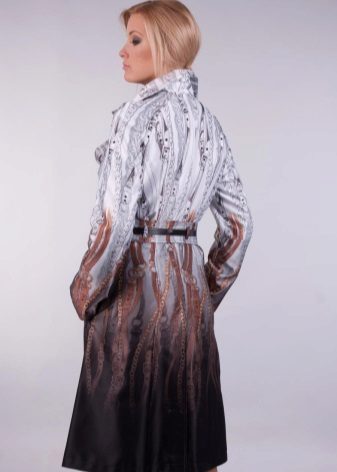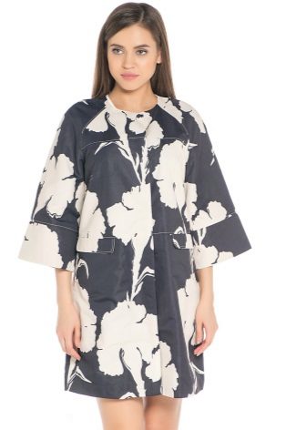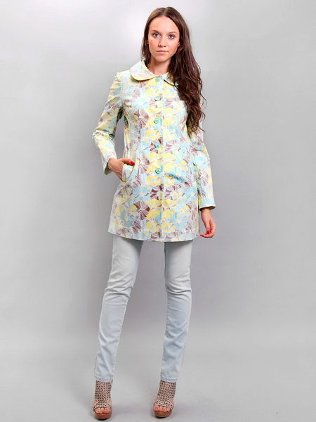 No less popular and colorful raincoats, combining several shades.For example, raincoats with a floral print, models with stripes, a print in small and large peas, with color stains, as well as with prints in the form of geometric shapes or patterns in oriental style.