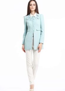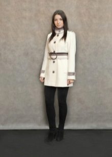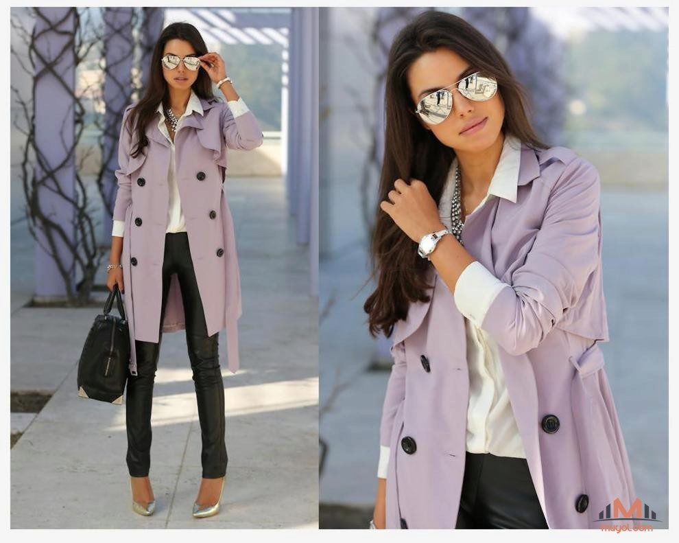 The fitted model of a coat of light lilac color will be perfectly combined with leather leggings and a white shirt. A big black bag fits this set as well as possible, and silver heels with a heel will become a bright spot.