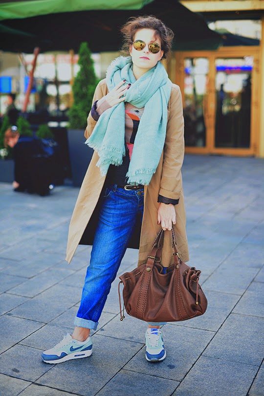 A striking combination of a black and white vest and jeans with cuffs will perfectly complement the classic model of a sandy raincoat, giving the image a note of rigor and balance. And red sneakers will be a bright, unusual spot and will refresh a quieter combination of other things.