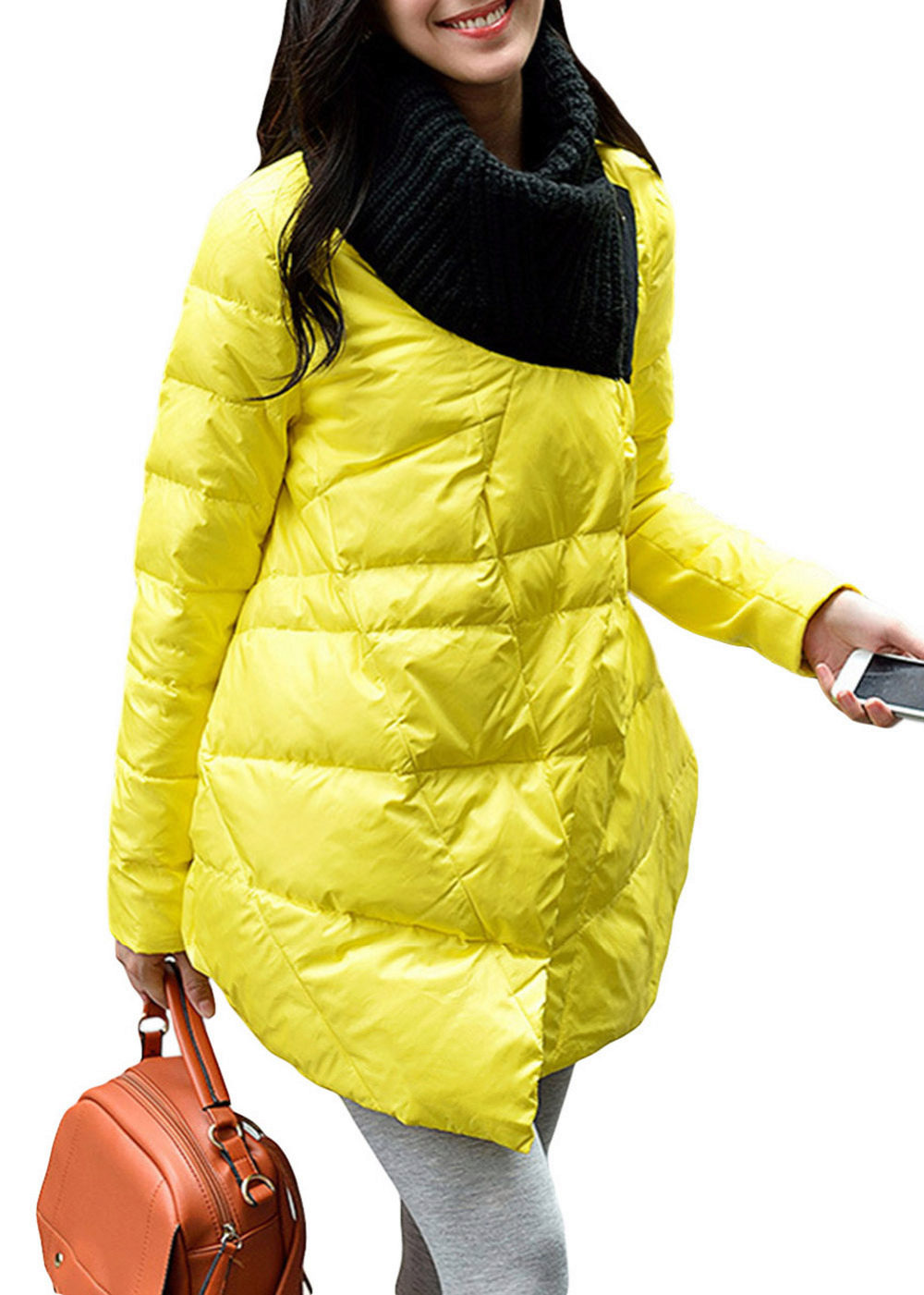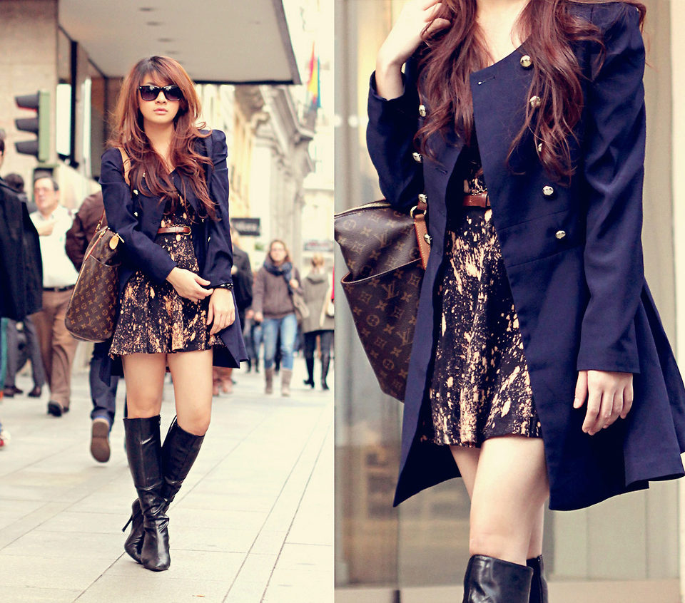 The black A-silhouette cloak will look great with a dark dress decorated with bright peach-colored spots. Complement this look with black knee-high boots with a heel and a dark brown tote bag.