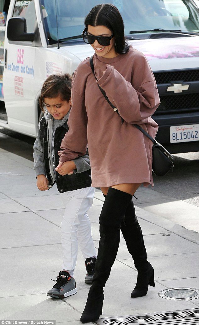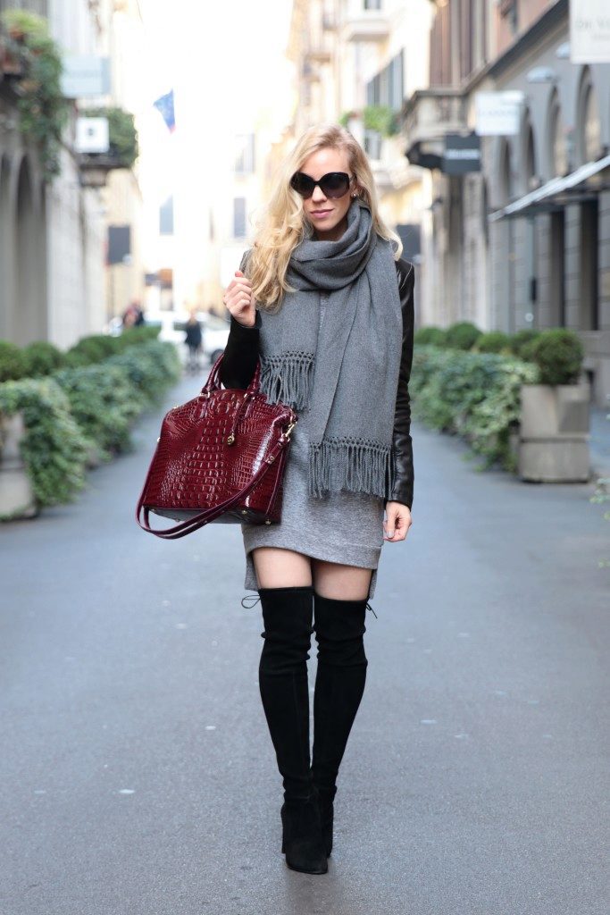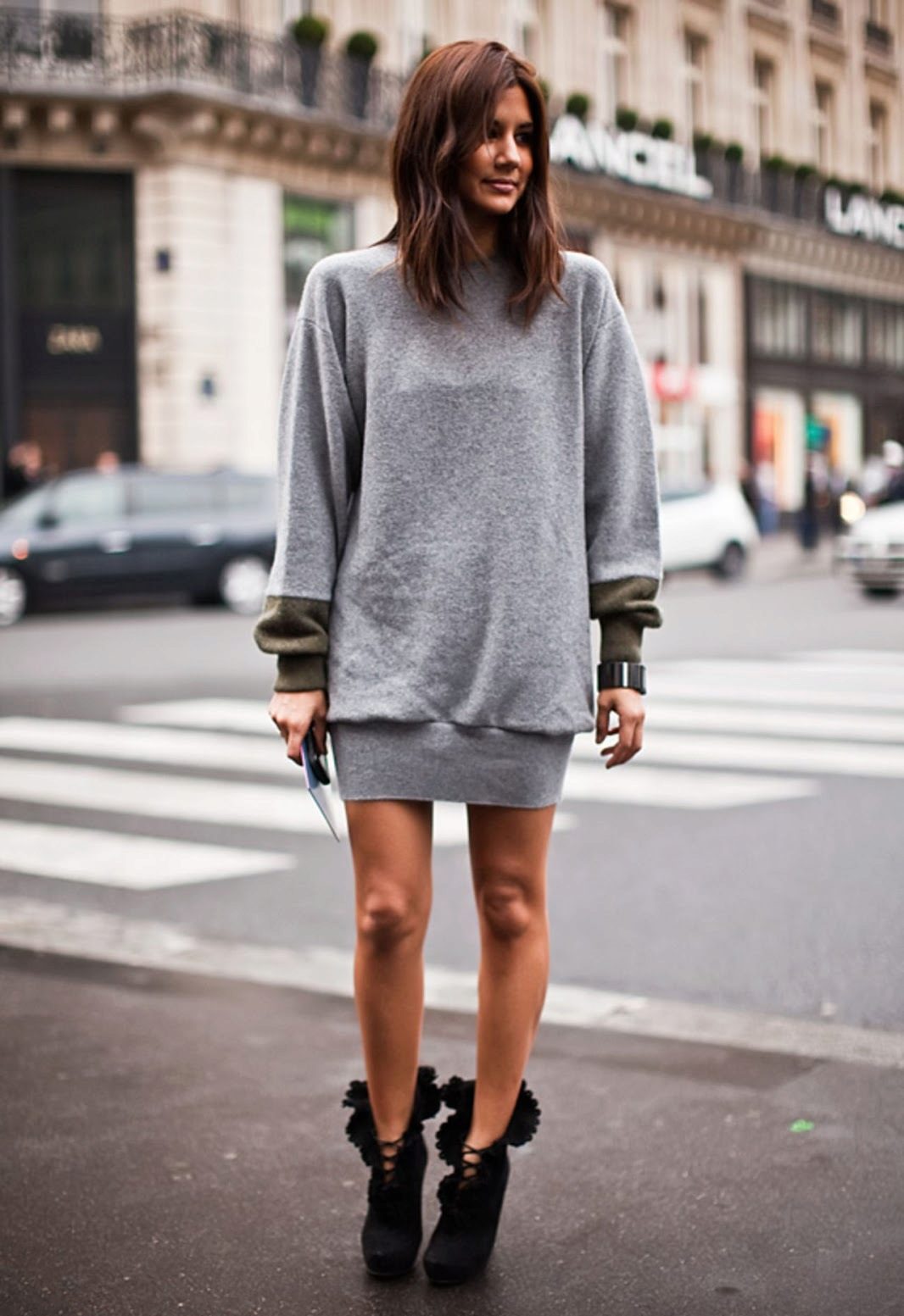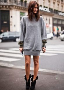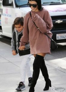 A short sweatshirt dress with high suede boots looks intriguing and spectacular, because it's so hard to imagine a combination of two things so different in style.