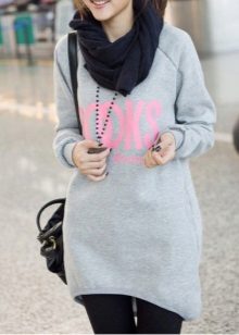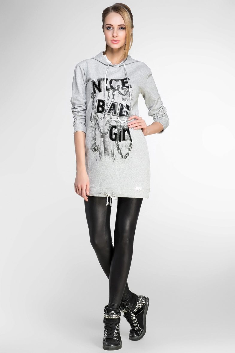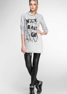 Sweatshirt dress is an independent article of clothing. However, some models, for example, oversize and short, will look good with jeans and leggings, respectively. However, most often under dresses, hoodies wear tights, both thin kapron and warm. In the summer and spring, you can do without additional insulation of the legs. On top of the tight-fitting light models in the fall, you can safely wear bombers and leather jackets.