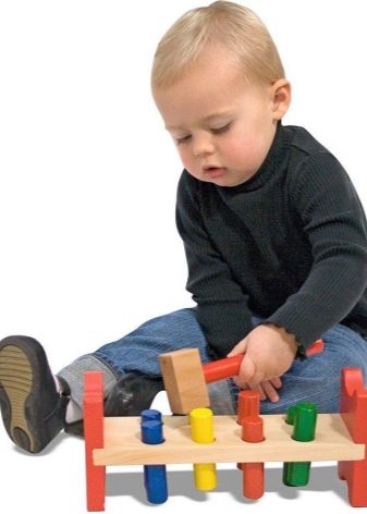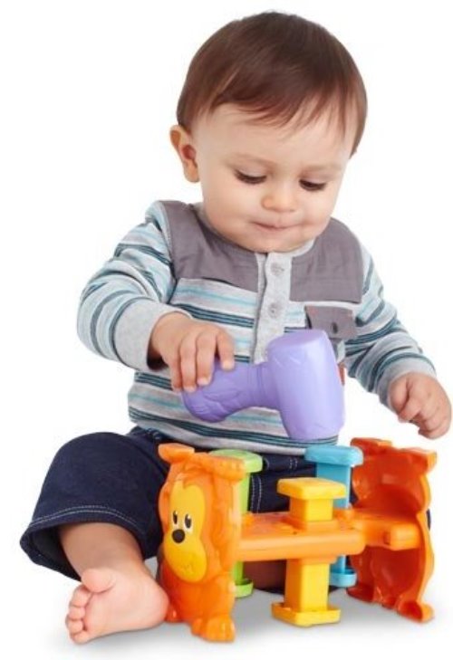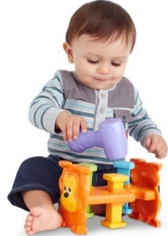 Kids from seven to eleven months are not indifferent to everything that makes noise, rustles and rings. In addition, they love to check everything for durability and love to knock all those items that fall under his arm. Therefore, you can give a kid bright and beautiful hammer. With each blow, he will squeak, which will bring real pleasure to the child. In addition, there are options where a special panel with pegs is attached to the hammer. The child will be able to knock them down during the game.