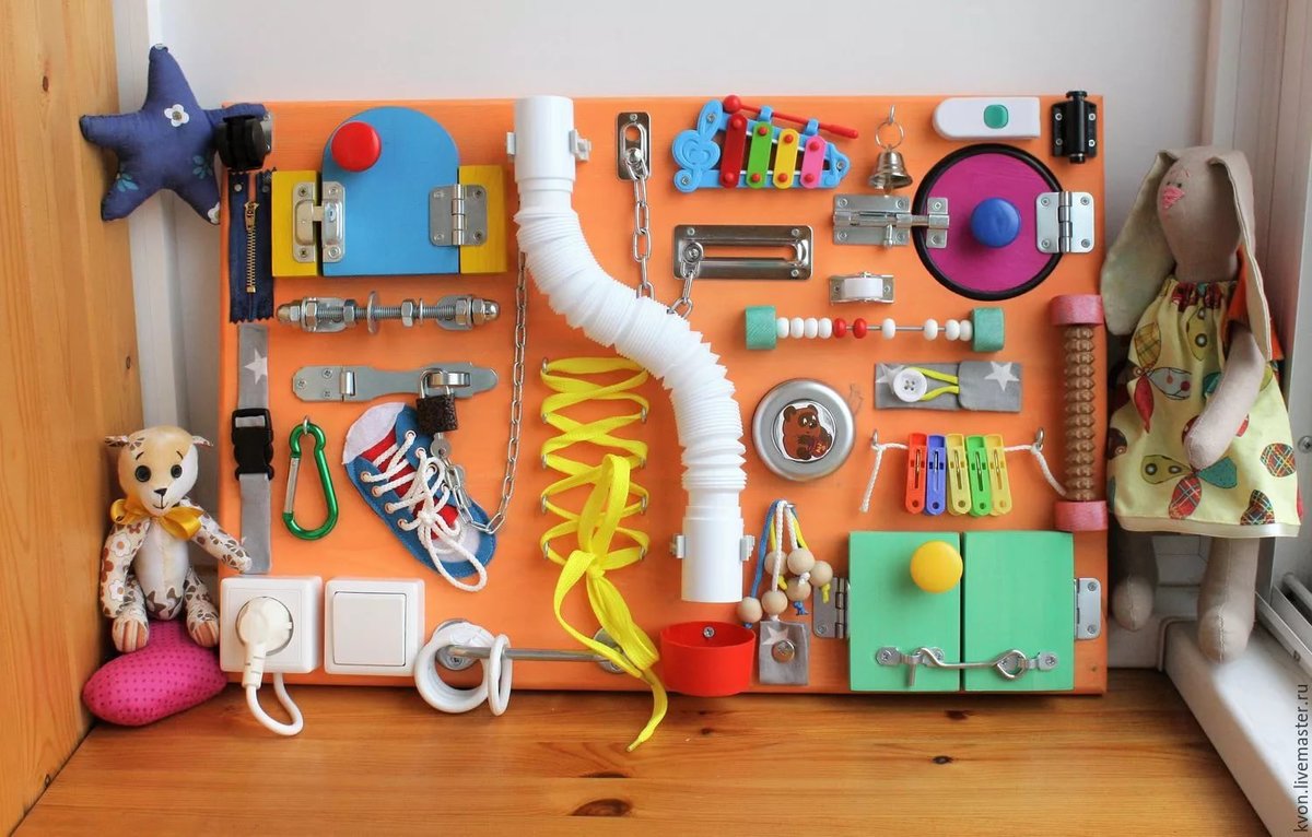 Surely, you have noticed that from the age of seven months, children show interest in door handles, locks, buttons, and so on. They like everything that can be opened, closed, twisted or unscrewed. Therefore, a very useful and relevant gift for the baby will be bizybord or, in other words, an interactive board. This board is easily mounted on the wall, or it can be kept on the floor. On such a board is everything your heart desires. Namely, these are bolts, bills, switches, hooks, locks, door chains, telephone discs and so on.