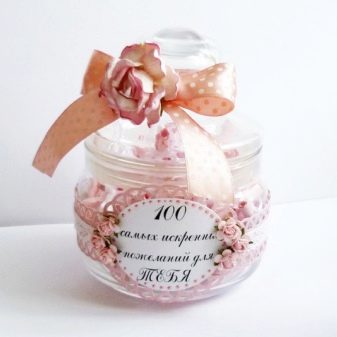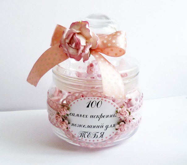Today is considered a popular option decorative jar filled with notes. This gift can also be easily made with your own hands. On each piece of colored paper, you can write good wishes to the birthday girl. The jar can be decorated with colored paper, cardboard and glitter.