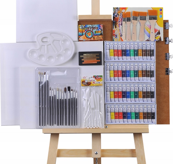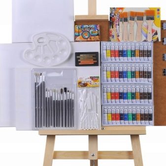 Easel, paints, brush sets waiting for young artists. A device for burning combines work with wood and drawing, and embossing tools - drawing and metal.