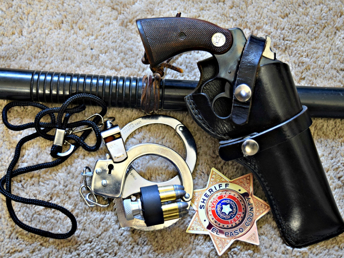 - Policeman recruitment with a badge, handcuffs and a pistol in a holster.