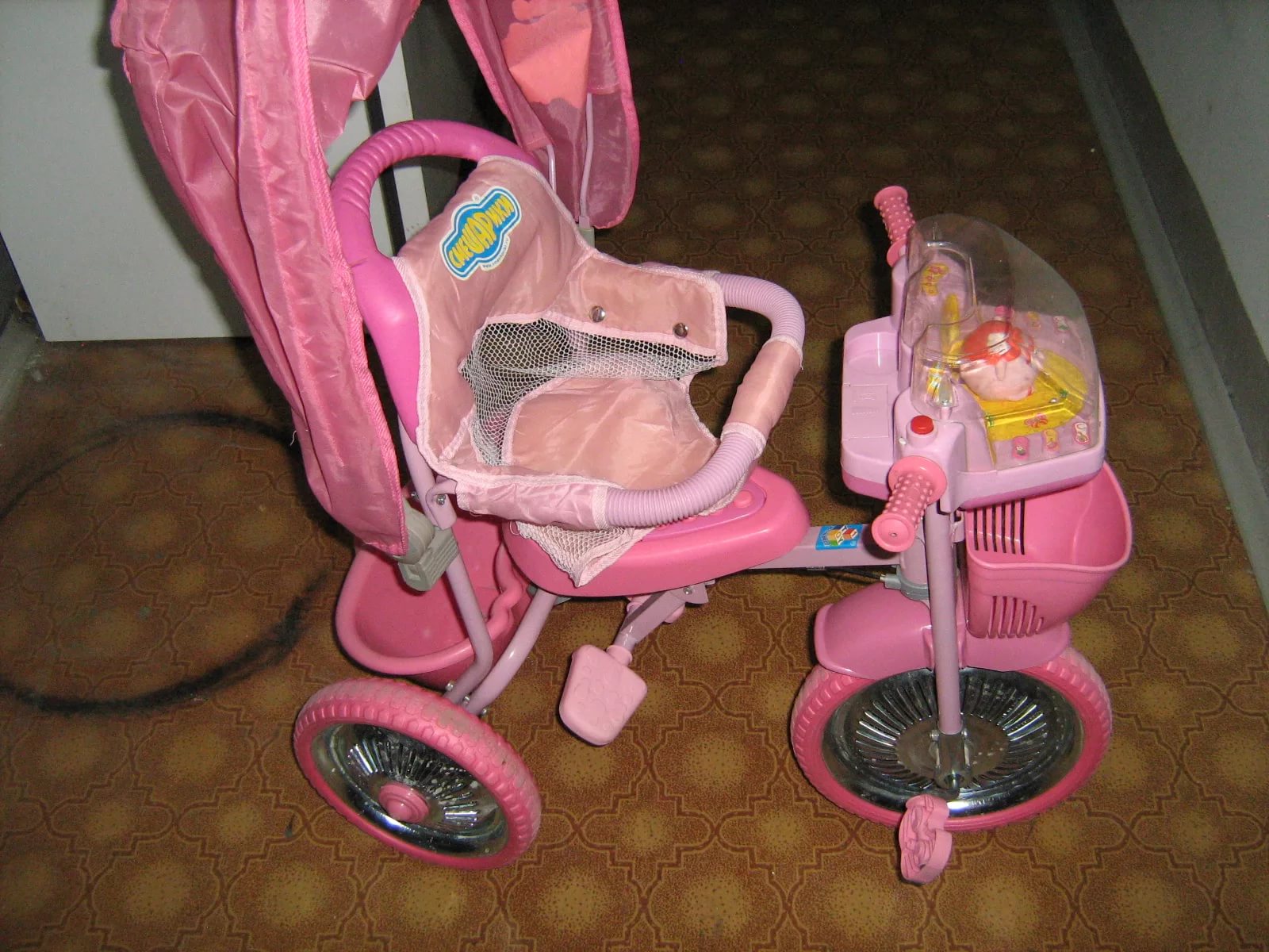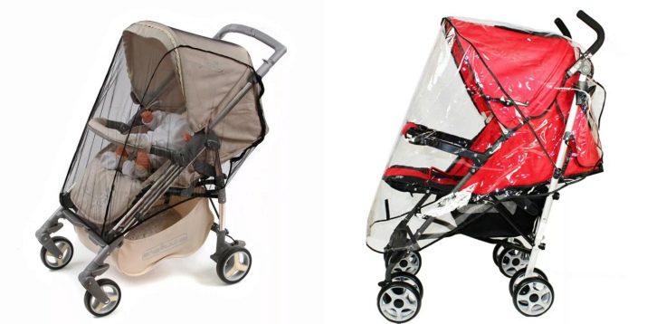 - stroller for walkinghaving a rain coat and an insect net.