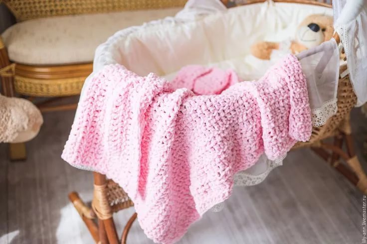 Warm knitted plaid for a baby is just a great option to protect her on street walks from the draft. And in the winter it can be a nice addition to a small children's blanket, if the house is cold. This kind of pladik can cover a girl’s bed when she is awake and moves in walkers.