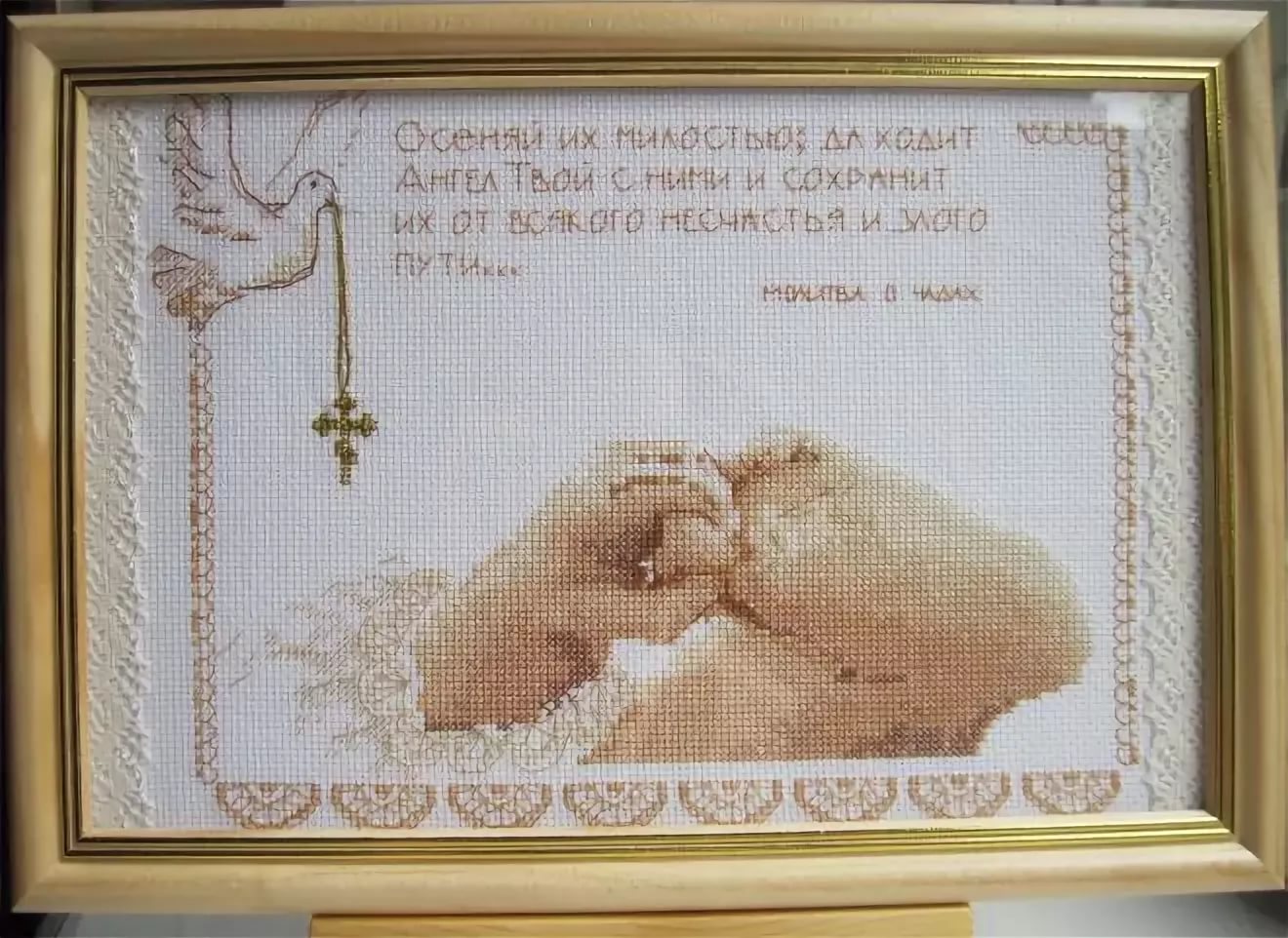 A beautiful image and a prayer that is embroidered with a cross for a baby is both an interesting gift and a special talisman that will be a protection for your baby for the rest of her life.