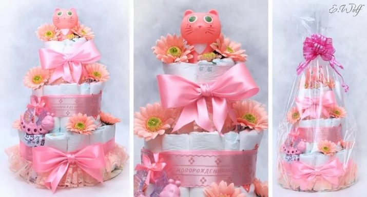 A cake made from different sized diapers is a rather creative gift, and a good help for young mothers and fathers, since nowadays diapers are not cheap, therefore such presents will be considered quite appropriate.