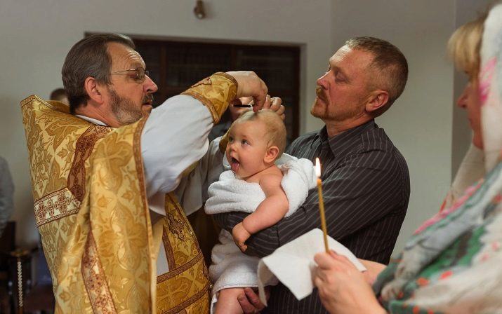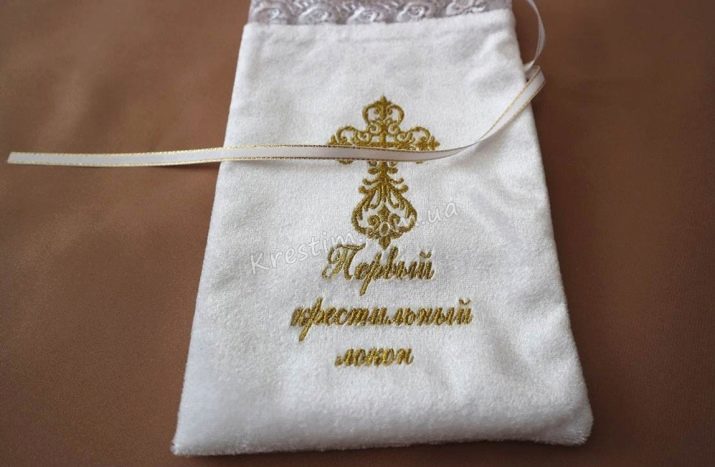 If you wish, you can give your godson a thin diaper. If the boy is in infancy, he is first wrapped in a film, and then afterwards in a kryzhma. Products as usual are decorated with embroidery in the form of a cross, baby name, various church symbols, patterns. A bag for storing cut strands is not an obligatory thing, but very touching and memorable for parents of a baptized baby.