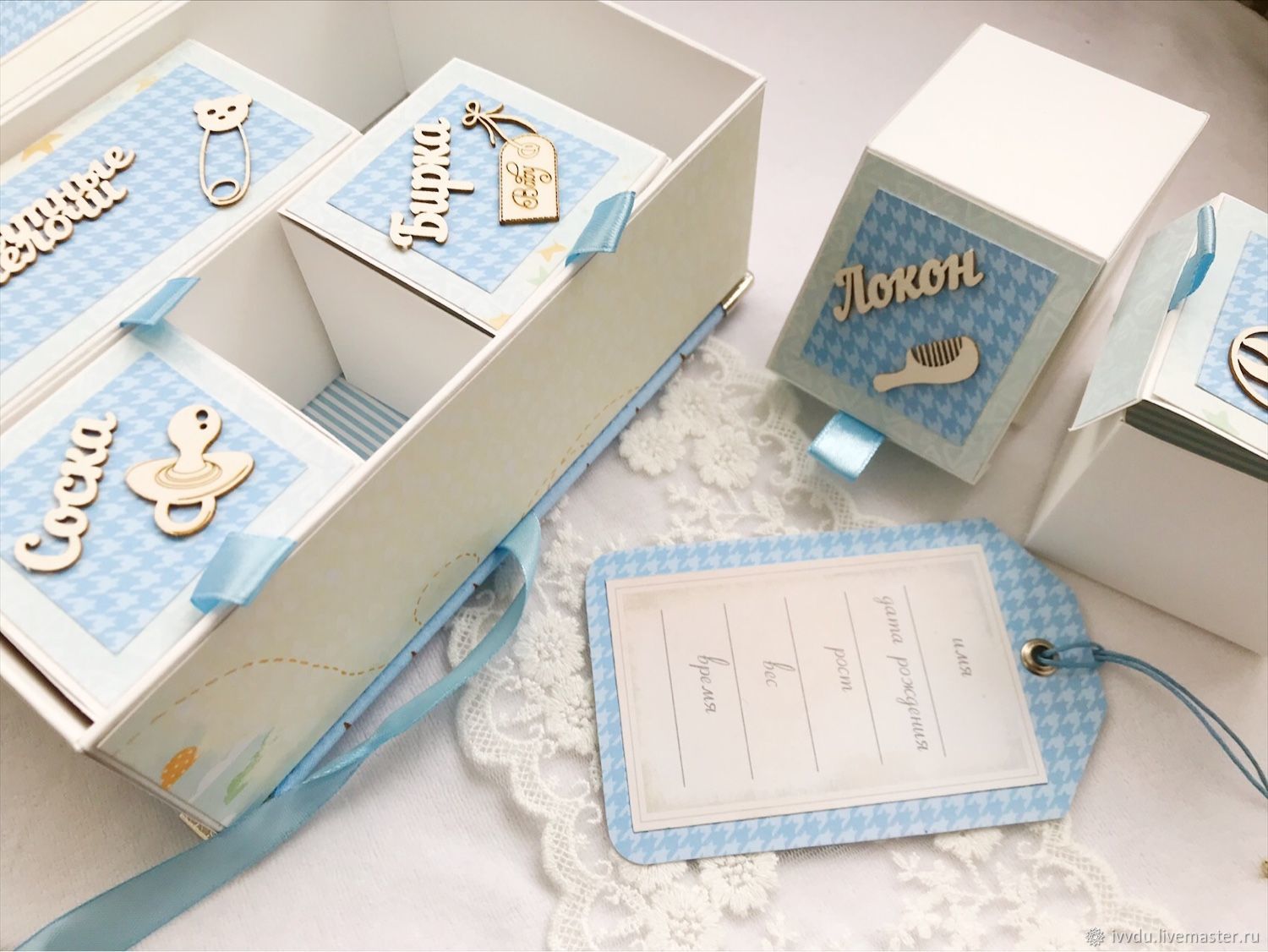 You can arrange for the newborn boy a box called "Mother's treasures." It will be a beautiful box in which parents will save the first clipped curls, the first fallen tooth, tags from the hospital, etc. You can decorate the box-box in a variety of styles, the main thing is to convey the message itself and match the idea that its content belongs to the boy.