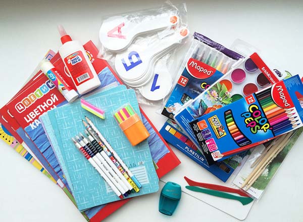 - A large set of stationery. There are not just big, but huge sets of 290, 350, 400 items in a large reliable organizer-book. It includes erasers, pencils, felt-tip pens, a set of brushes for drawing, ball pens of different colors, gel pens, sharpener, rulers, a paper knife, proofreader, plasticine and lots of other useful things.
