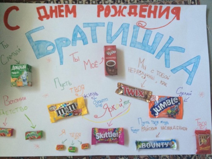 With culinary skills, you can please the brother-birthday and sweet gift, such as chocolate, berry, yogurt or fruit cake. Ideally fit into the festive theme and the corresponding greeting inscription on the treat. To present such a sweet gift is best in a bright and colorful box.