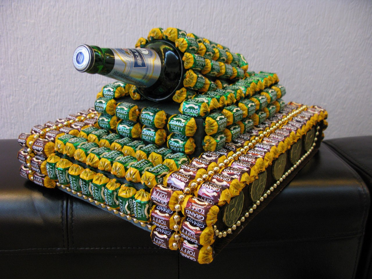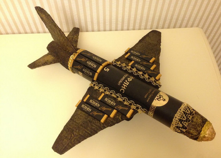Another good idea - a candy plane - a great gift for men of different ages. At first glance, an odd job may seem rather complicated, but it is not. First you need to make a frame, and then just glue over the candy in shape. Most of these handicrafts are made according to this scheme.
