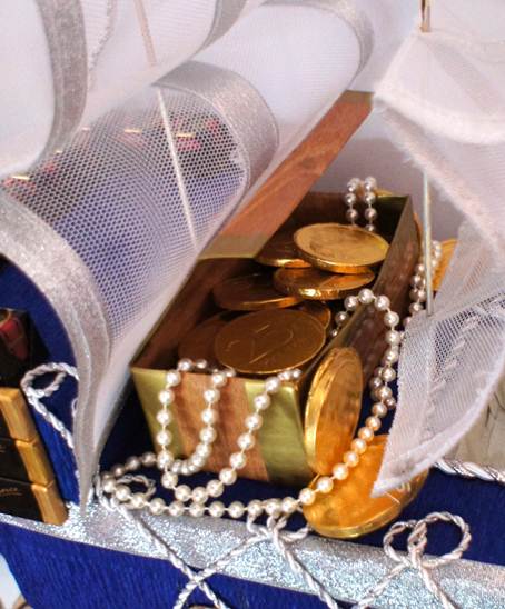 - Chocolate coins and candy in a golden wrapper can be glued to the nose. Square candy glue on the stern.